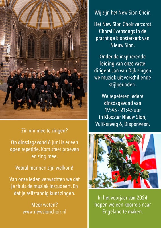 Het New Sion Choir verzorgt Choral Evensongs in de prachtige kloosterkerk van Nieuw Sion. Onder de inspirerende leiding van dirigent Jan van Dijk zingen we muziek uit verschillende stijlperioden.